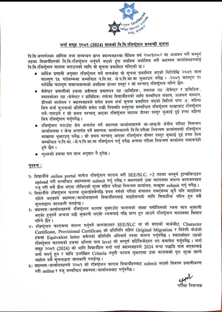 भर्ना समूह २०८१ (२०२४) सालको त्रि.वि. रजिष्ट्रेशन सम्बन्धी सूचना Uncategorized January 31, 2025 / 0 Comments