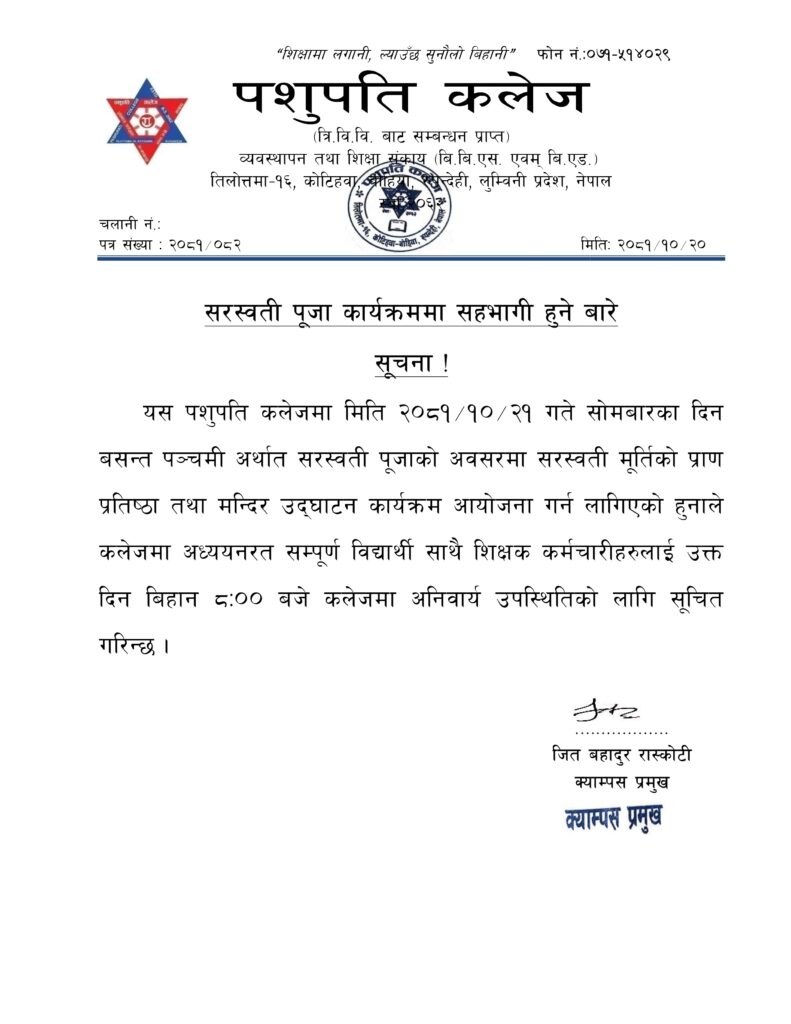 यस पशुपति कलेजमा मिति २०८१/१०/२१ गते सोमबारका दिन बसन्त पञ्चमी अर्थात सरस्वती पूजाको अवसरमा सरस्वती मूर्तिको प्राण प्रतिष्ठा तथा मन्दिर उद्घाटन कार्यक्रम आयोजना गर्न लागिएको हुनाले कलेजमा अध्ययनरत सम्पूर्ण विद्यार्थी साथै शिक्षक कर्मचारीहरुलाई उक्त दिन बिहान ८ः०० बजे कलेजमा अनिवार्य उपस्थितिको लागि सूचित गरिन्छ ।